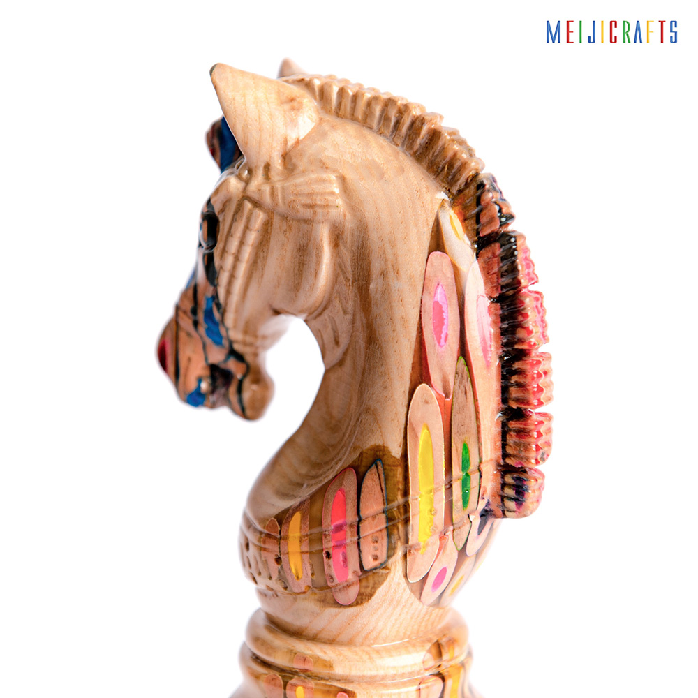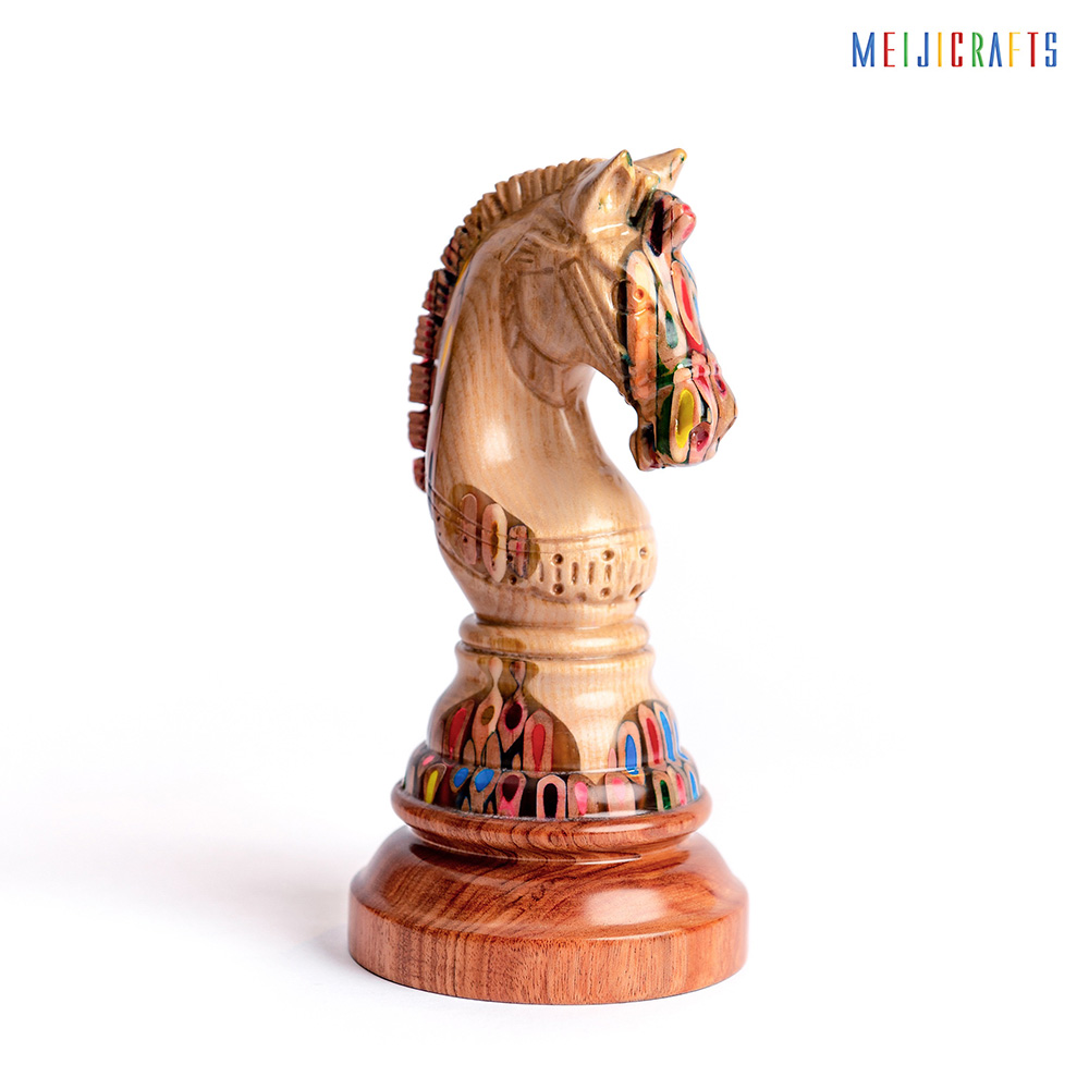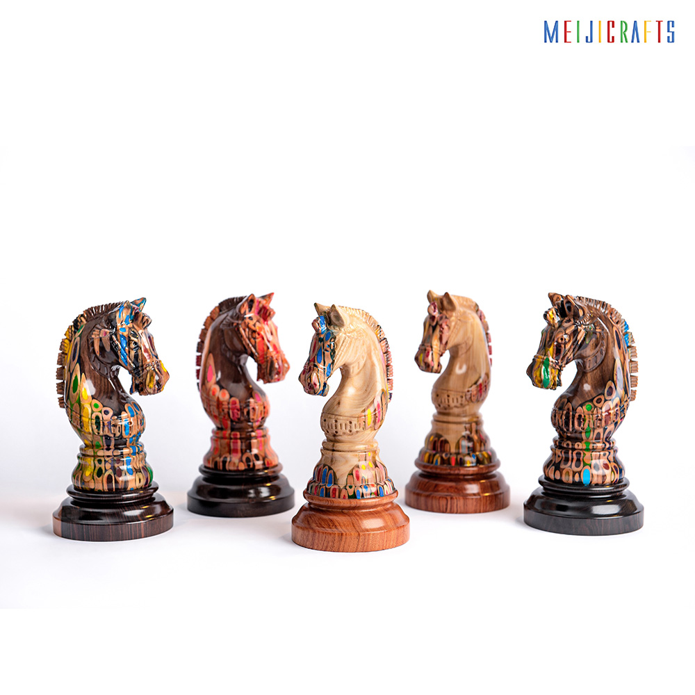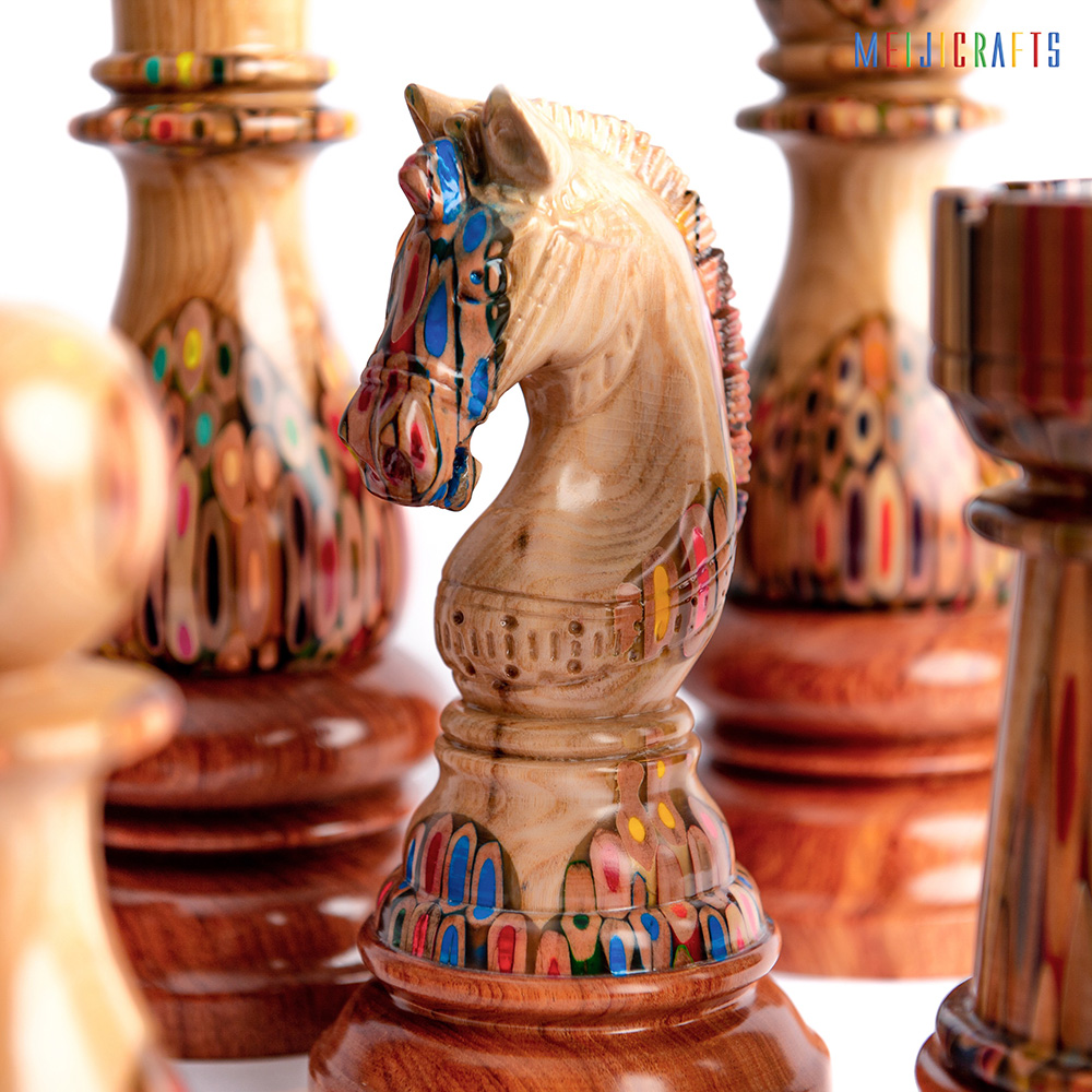 Similar in material to other chess pieces, the Elysium Knight is made from 123 colored pencils (multi-color pencils), clear epoxy resin and two types of Ash wood (white with beautiful ) and Padouk wood (Red color base).