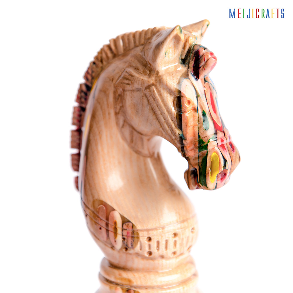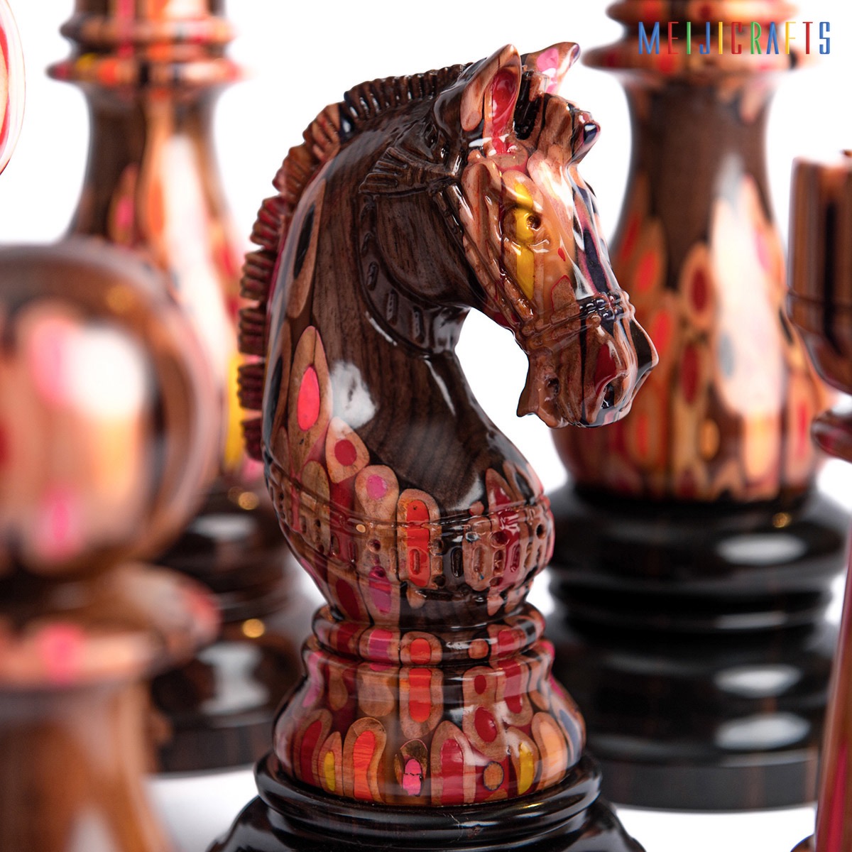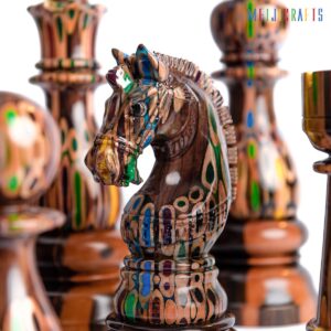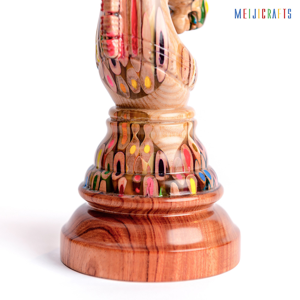 Similar in material to other chess pieces, the Elysium Knight is made from 123 colored pencils (multi-color pencils), clear epoxy resin and two types of Ash wood (white with beautiful ) and Padouk wood (Red color base).